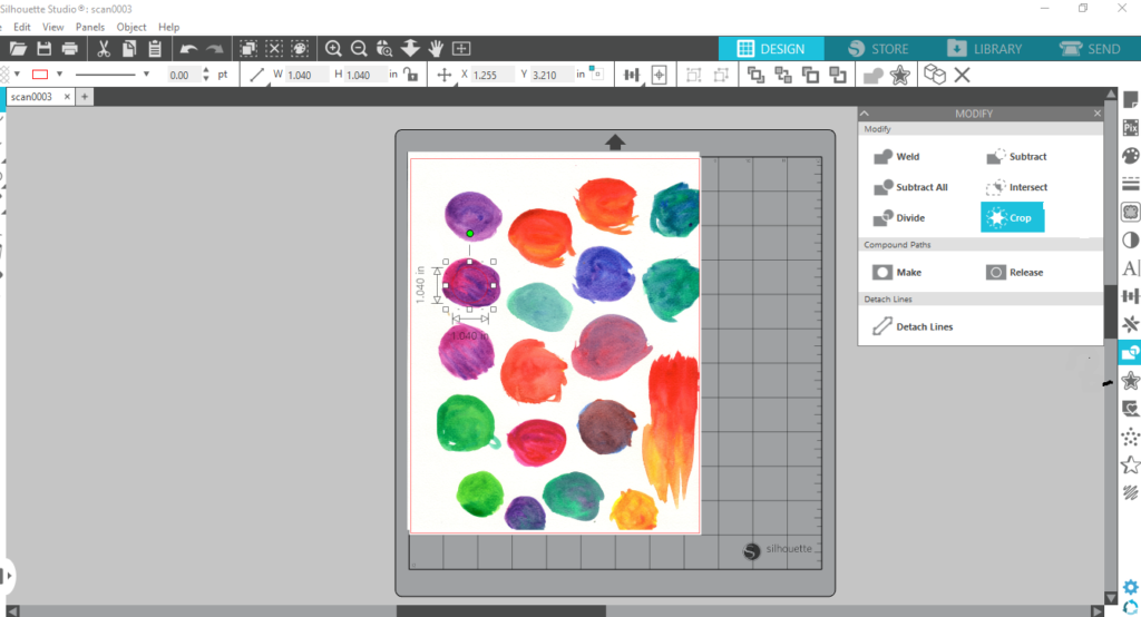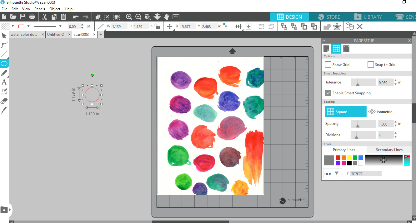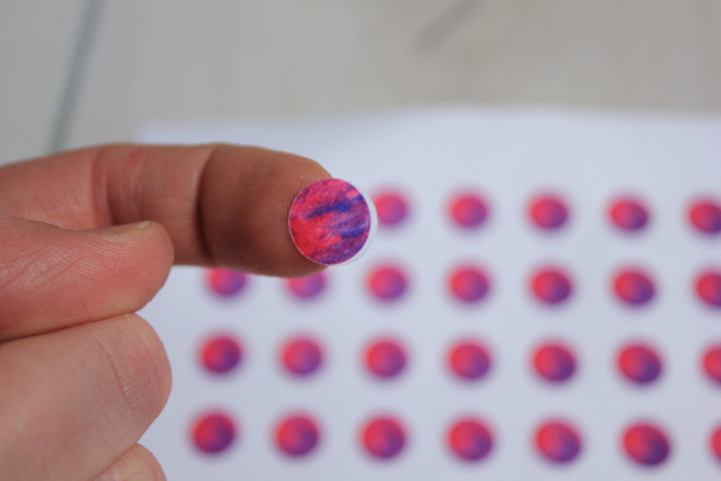 Move that circle onto the area you want to create the sticker with. For this tutorial I’m create just one sticker, so I’m only putting a circle on one of my dots. You could also copy the circle shape and place it on the the other water color dots to make a bunch of different colored stickers.
