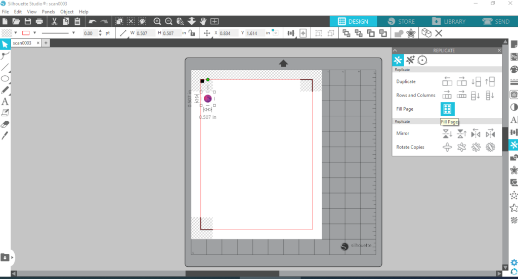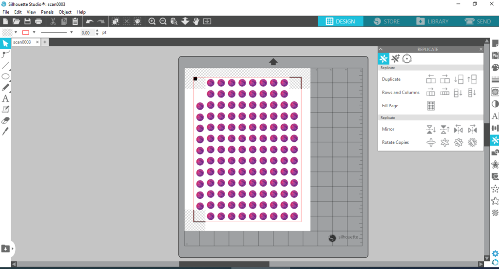 Obviously you are going to want more than one sticker, so you need to fill the page. Don’t worry, this is super easy to do! Start by adding registration marks by hitting M on your keyboard. This is important since your Silhouette will read those marks so that it knows where to cut when you send your stickers to your machine. You want to avoid putting anything in that area. To fill the page go the butterfly-like icon (it’s the square that is blue on the right), then select fill page. You’ll get now get the whole page filled (like below).