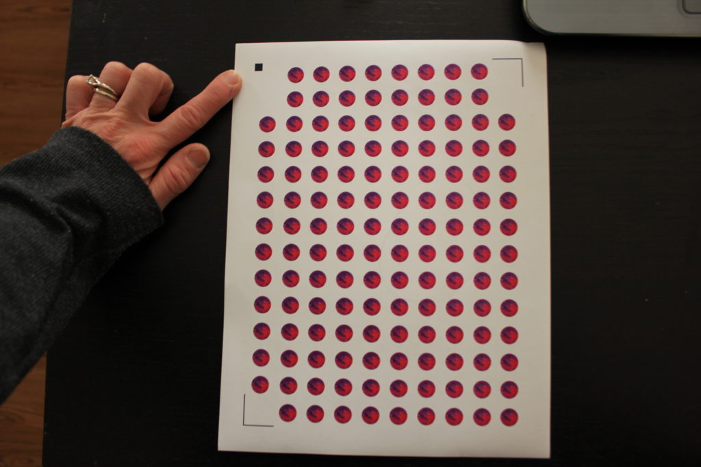 Now you want to print your stickers (on your sticker paper), by going to file then print. Make sure whatever sticker paper you use is compatible with your printer. You’ll see that you have the registration marks on your paper, as well as every sticker printed.