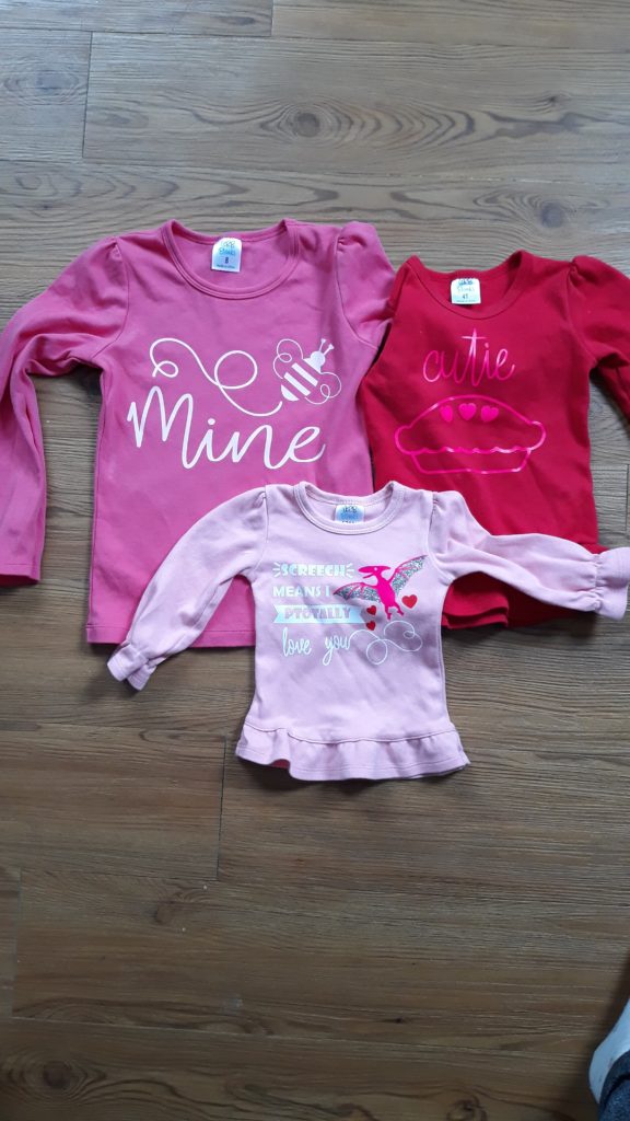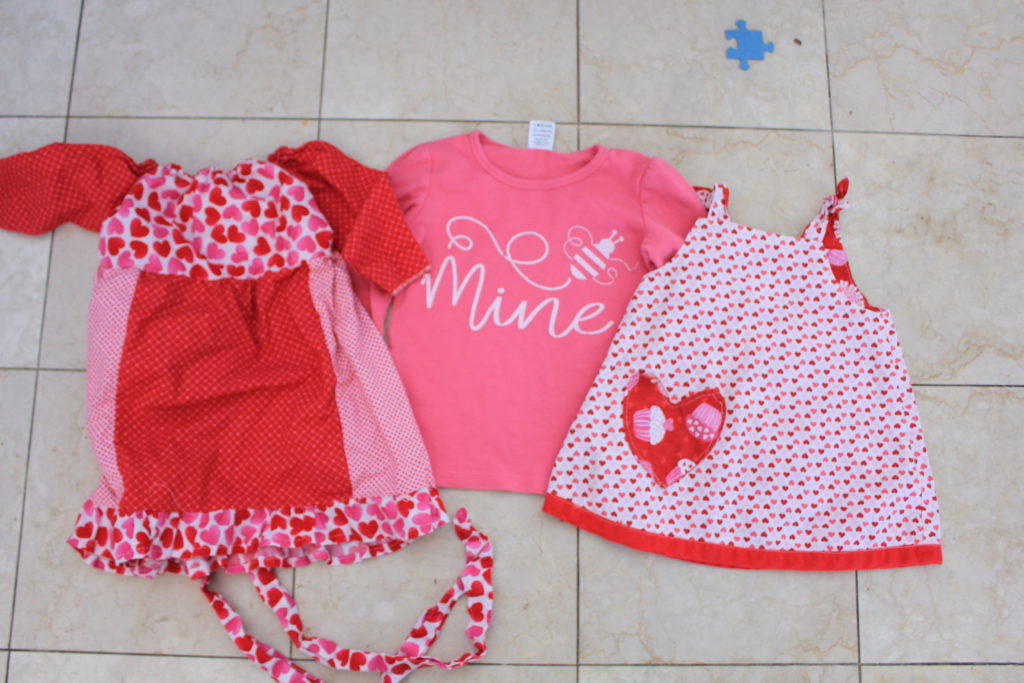 I usually try to make the girls some sort of Valentine outfit. It was much easier to do this when I only had to make one. Here are a few of the things I have made. The dress on the right is from when Annabelle was young, and now Aubrie can wear it too.