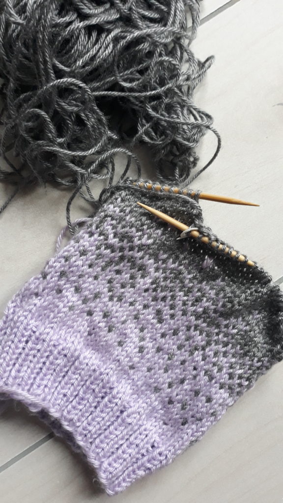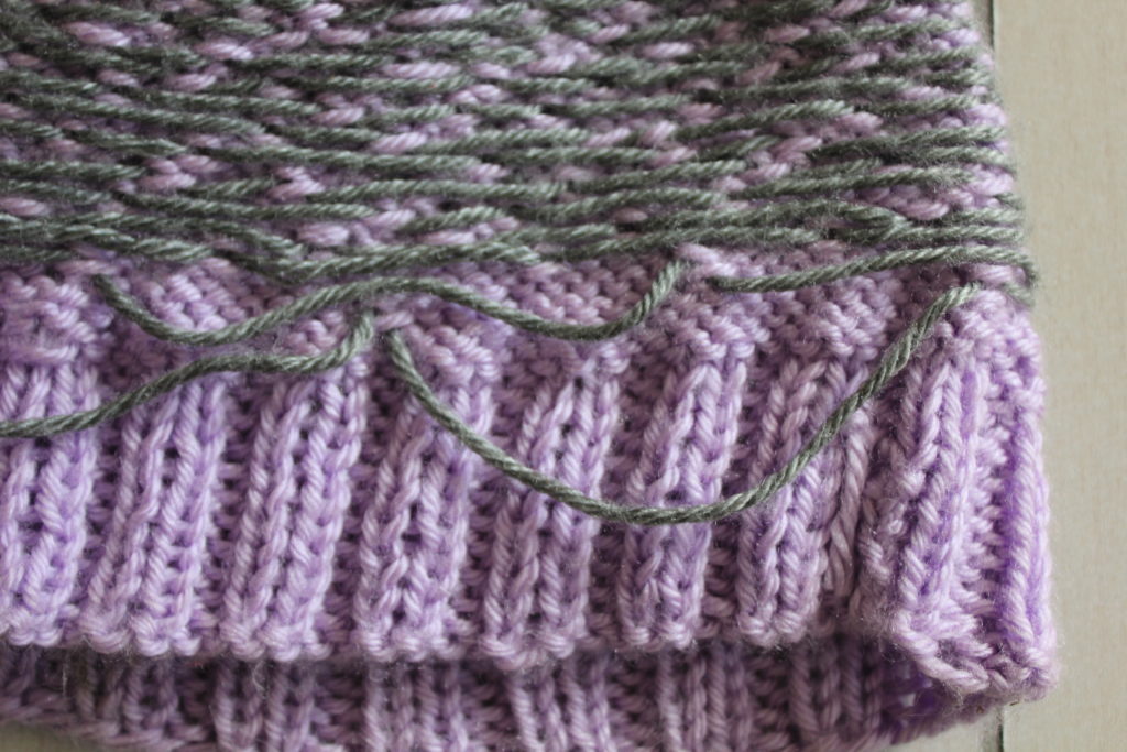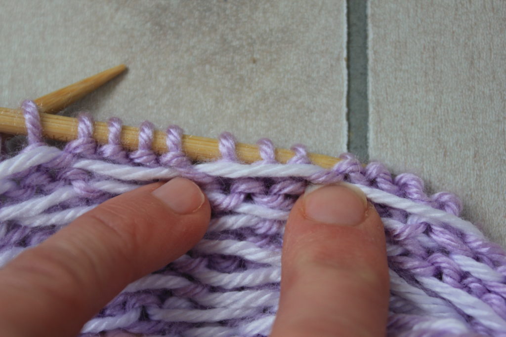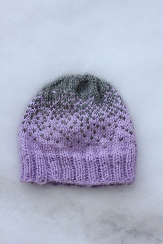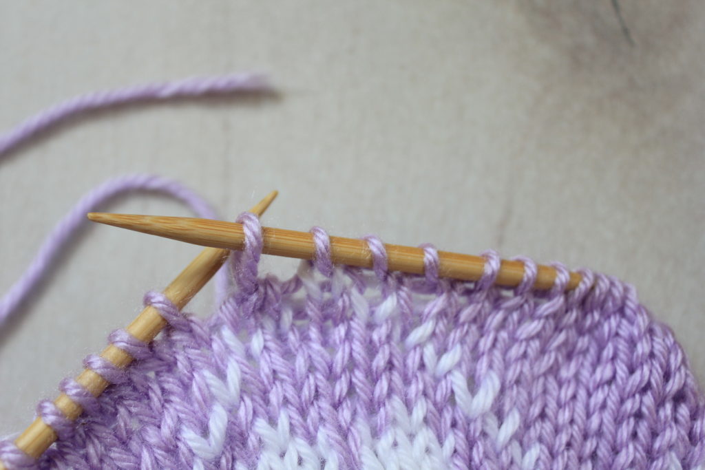 After I finished this hat, I did a little research and found that you really shouldn’t let a float get longer than 4-5 stitches. You can see in the example below (from a different hat I am knitting) that I have trapped the white yarn with the purple yarn. This really helps keep the tension not so wonky, which was a slight problem I had in the hat above.