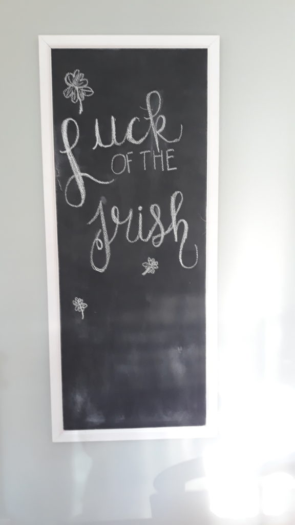 I finally erased the Thanksgiving chalkboard and put up a St. Patrick’s Day one! Nothing too fancy, and it’s a little bit crooked, but I am proud of how it turned out!