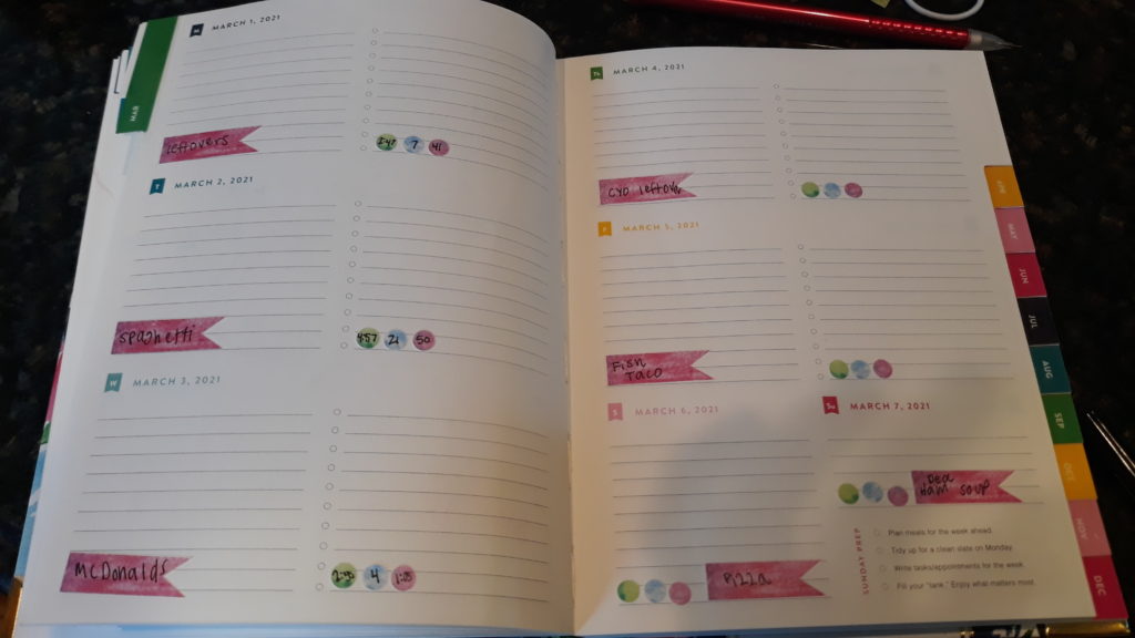 I finally printed up some more stickers for my planner. I am using them for meal planning and recording my screen time. The pink banner stickers are dinner, and the the little dots are to record my total screen time, along with time on FB and on IG. Doing this has also made me want to create my own planner. While I love the one I have, there are different things I wish it had. I’m going to start recording my ideas, to see if what I have in my mind is feasible for next year. Basically I want a quasi bullet journal, that has some pre-determined pages in it.