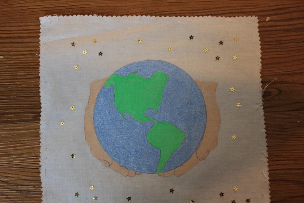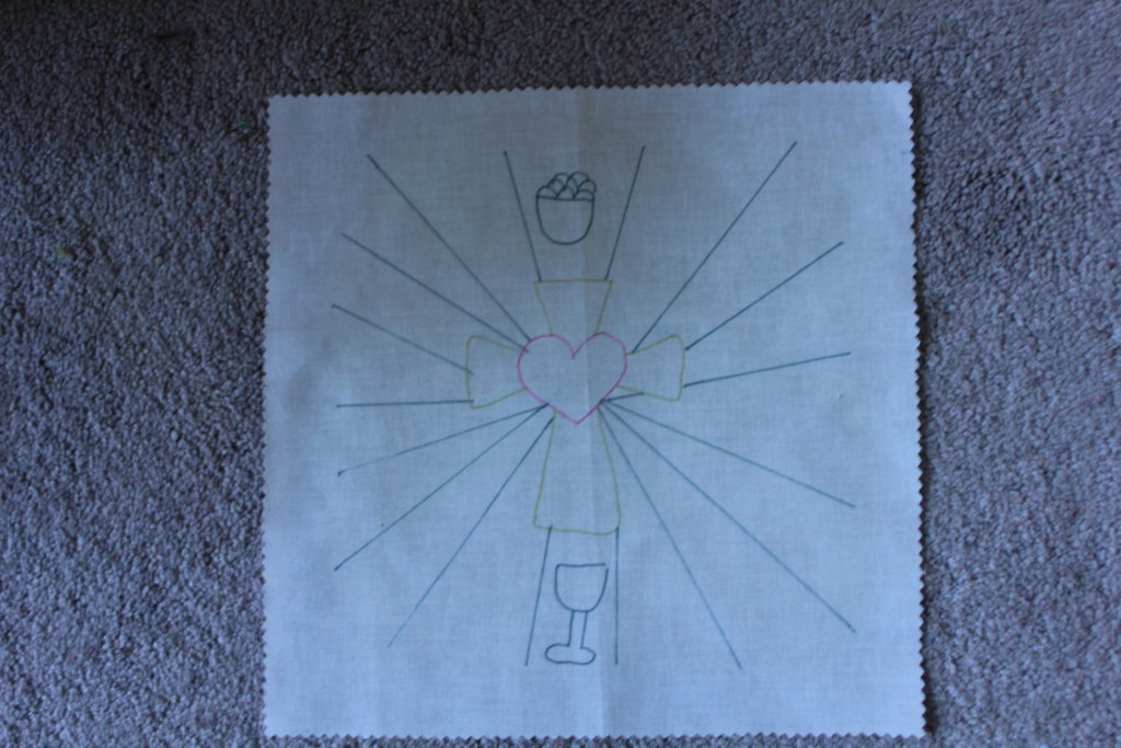 Finally, as part of Annabelle’s First Communion she has to decorate an alter square. I used infusible ink and my easy press to get the design (that Annabelle did, with some help from me) onto the square. She is then going to paint it. Everyone’s will be sewed together and then the whole cloth will be placed on the altar. I’m pretty excited, as I did one for my First Communion too (see it below.. obviously I had some help from my mom too…).