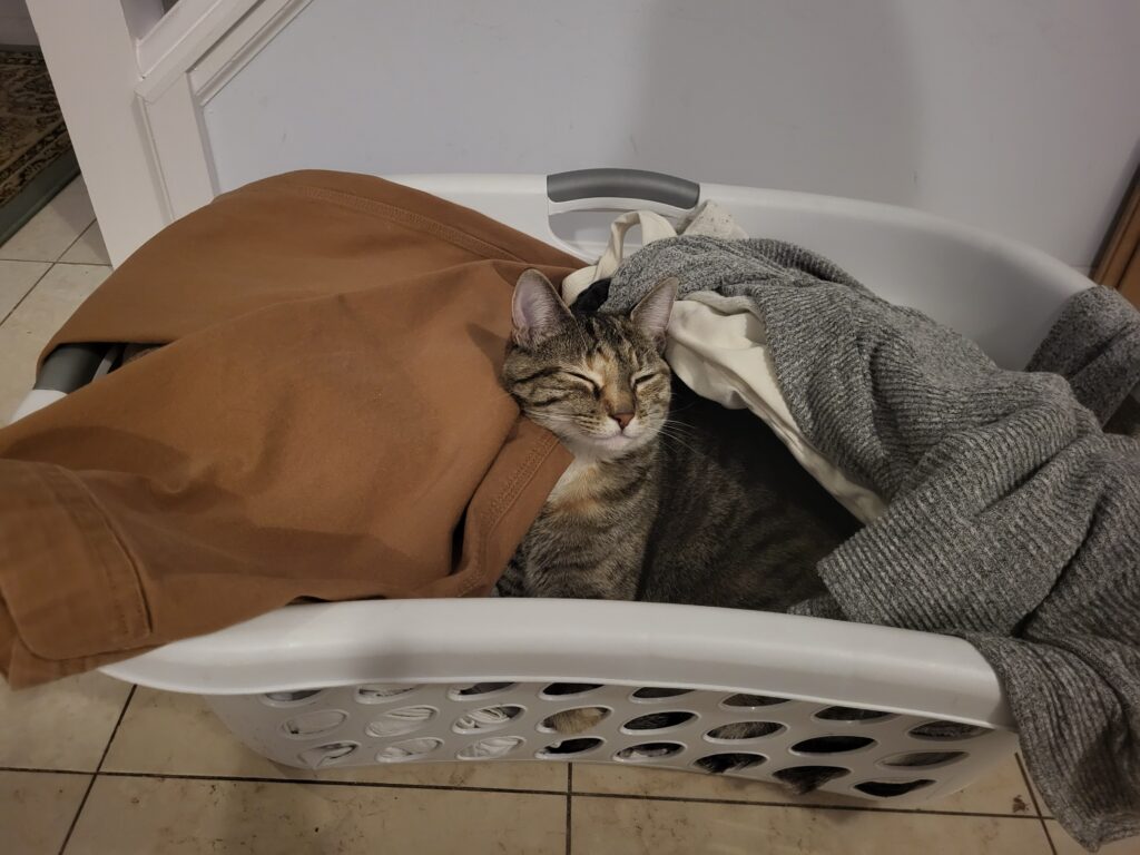 This cat loves hanging out in the clean laundry.