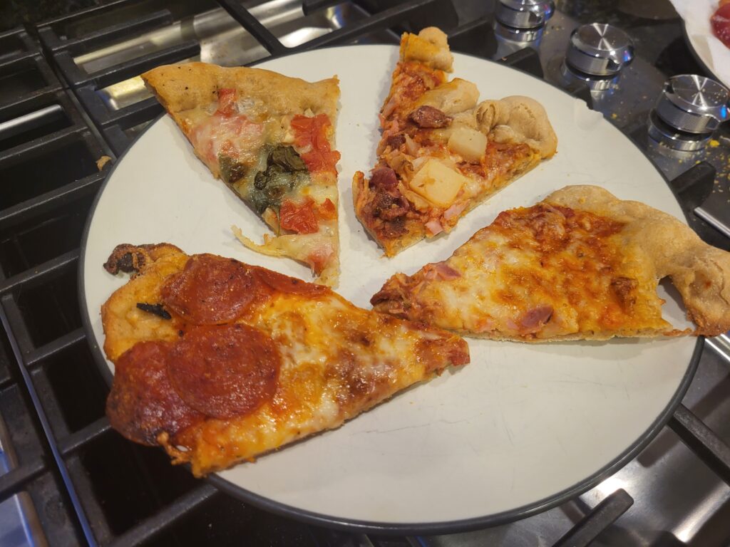 The rest of Sunday was spent playing catch up on laundry and other chores, as well as making some homemade stone pizza. I made pepperoni, cheese, ham/bacon/pineapple, and margarita. The dough didn’t turn out quite right, so I’m hoping I can figure out what changes need to be made to make a good pizza crust with home milled flour.