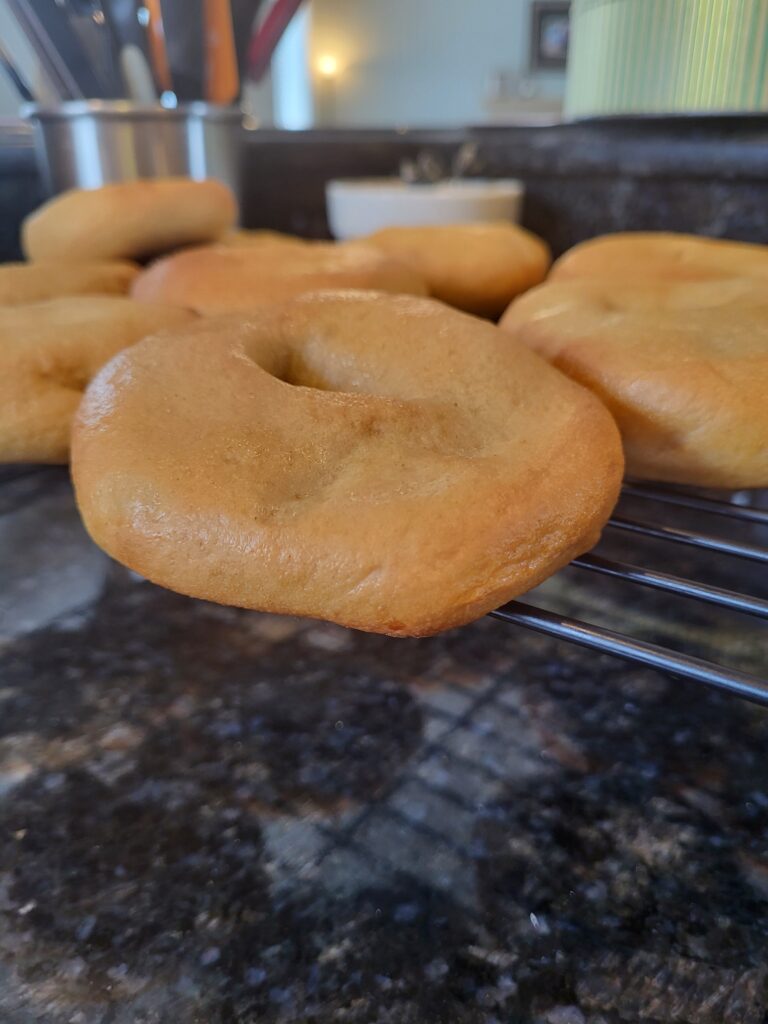 So I am trying to perfect my bagel recipe using home ground flour. After some research I learned many people let the bagels proof in the oven overnight. So I tried that. Unfortunately they kind of deflated after boiling (my guess is that they were overproofed). While they were tasty, the inside was much to fluffy. So I will tweak my recipe and keep experimenting. I have a feeling by the end of this my family will never want to see a bagel again.