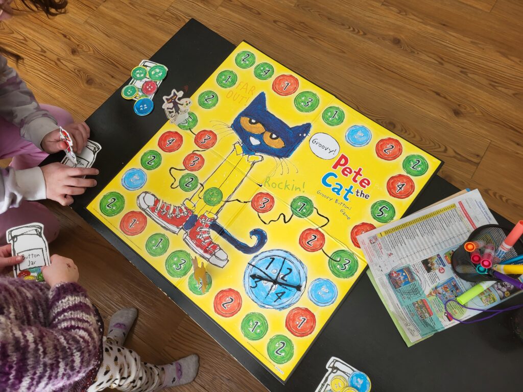 Pete the Cat and the Groovy Buttons: a simple game were you go around the board collecting buttons for your button jar, or putting them on Pete’s coat. Winner is the one with the most buttons.