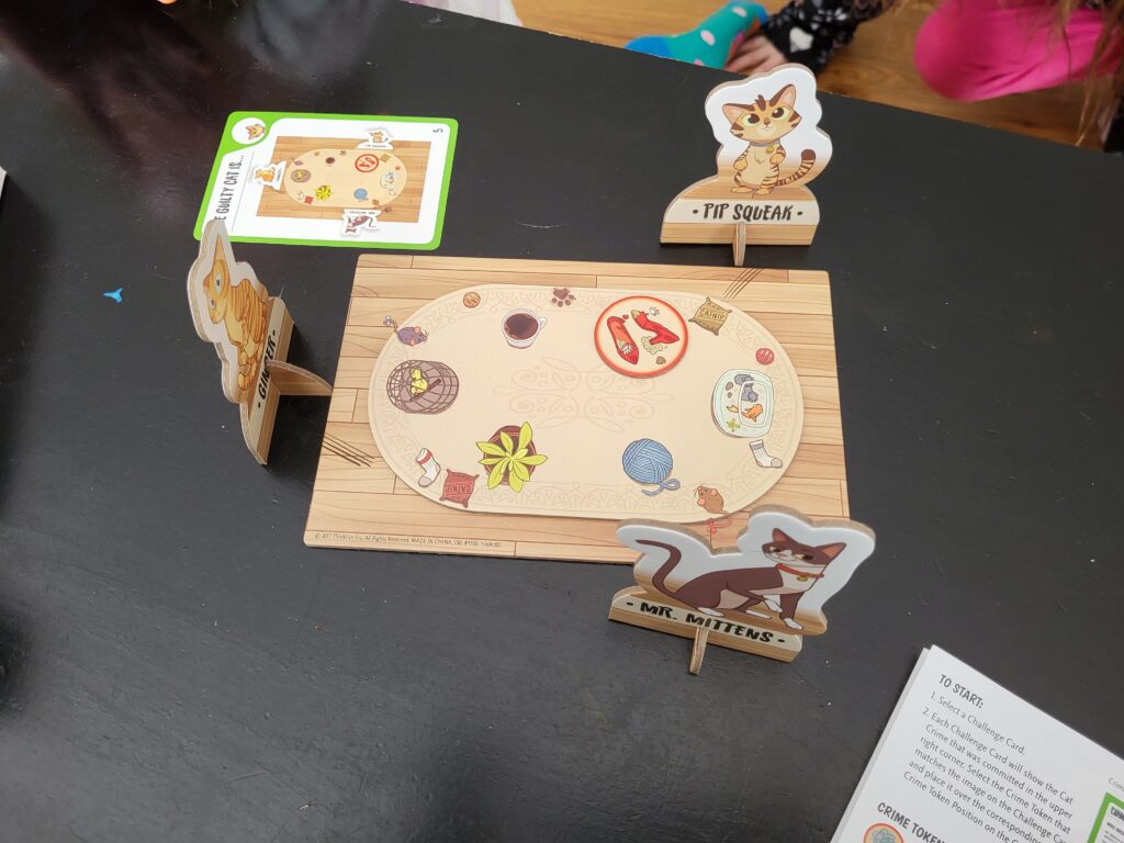 Cat Crimes: Technically this is a one person game. Each card has a “crime” and a set of clues on the front as to where the cats sit around the board. You have to figure out where each cat is, and who committed the crime. We had a lot of fun working together to solve the clue. There are easy-expert level clues. We looked at an expert level, but man it was hard!