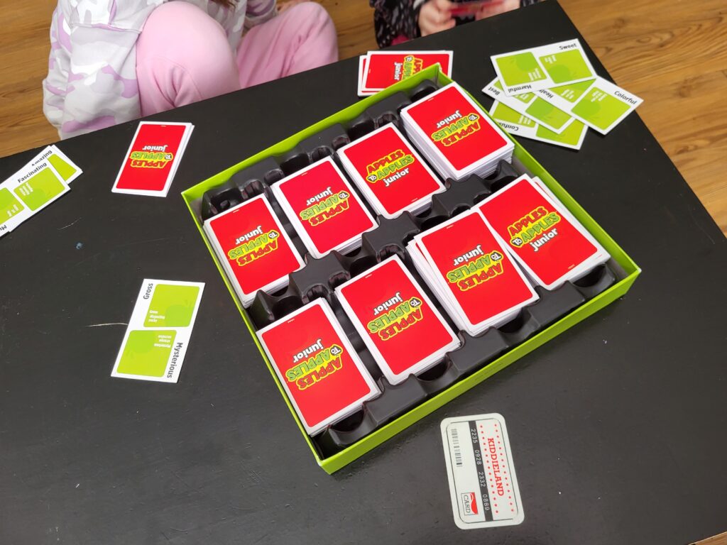 Apples to Apples Junior: In case you don’t know how to play this game, each player has five red cards in their hand. The judge reads a word on the green card, and you pick which red card most closely fits the green card.