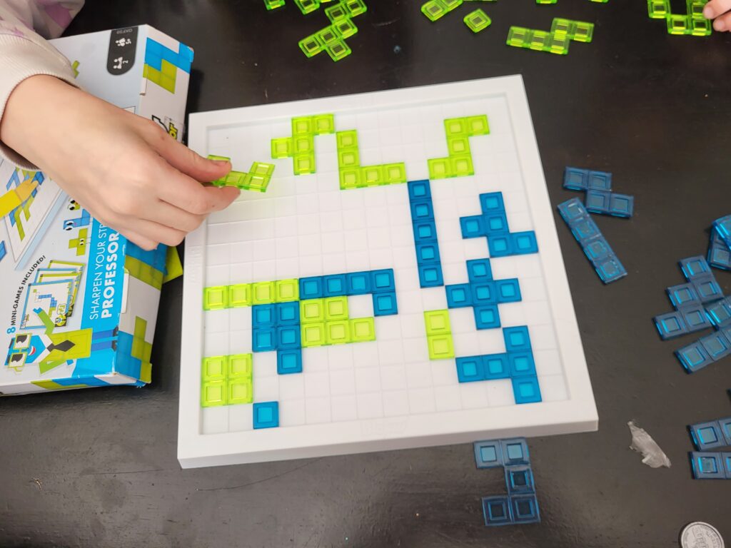 Blokus: This was my first time playing this game. Each player has a color, and they place the shape on the board. Same colors have to touch at a corner, but can’t touch anywhere else. The person with the most pieces at the end of the game wins.