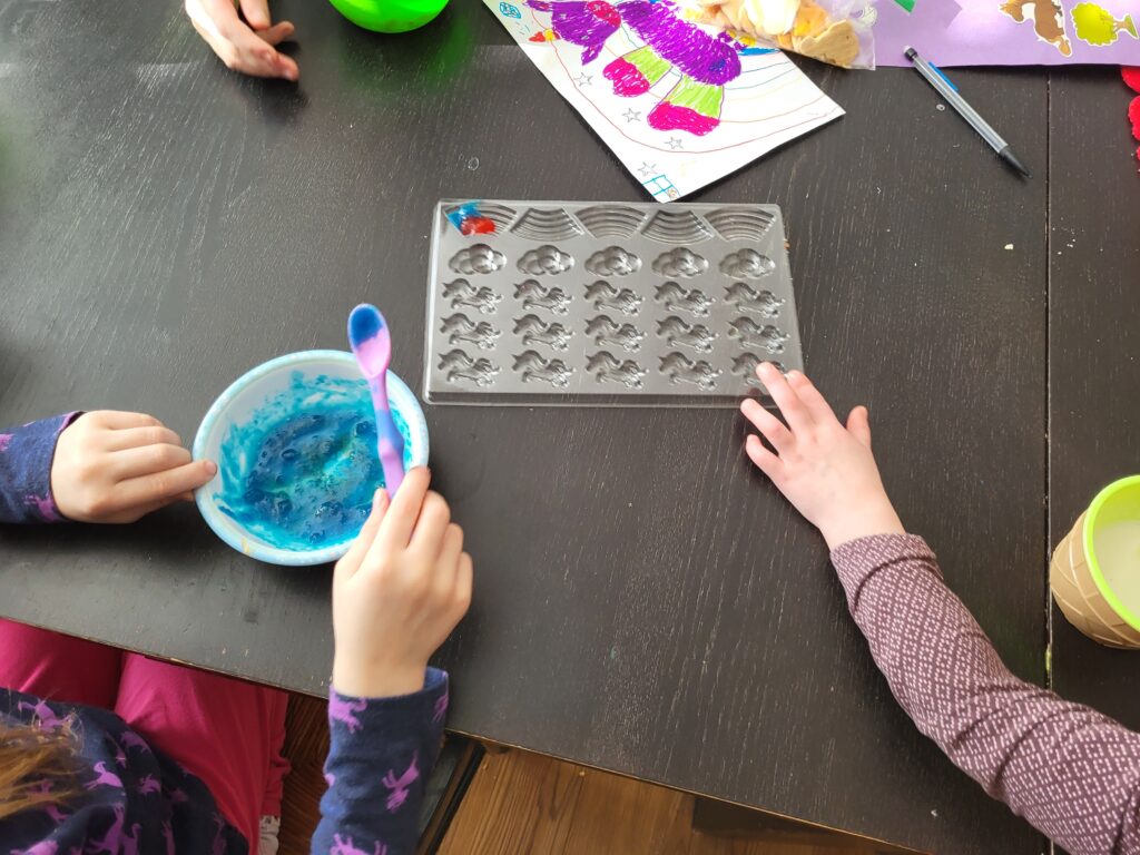 After playing some games, the girls asked if they could do some “crafts”. They have gotten quite a few that require some adult supervision, so I said ok. First up was make your own gummies. In all honesty it wasn’t too hard. But we quickly learned to only mix on flavor at a time, or else it gelled up way to quick.