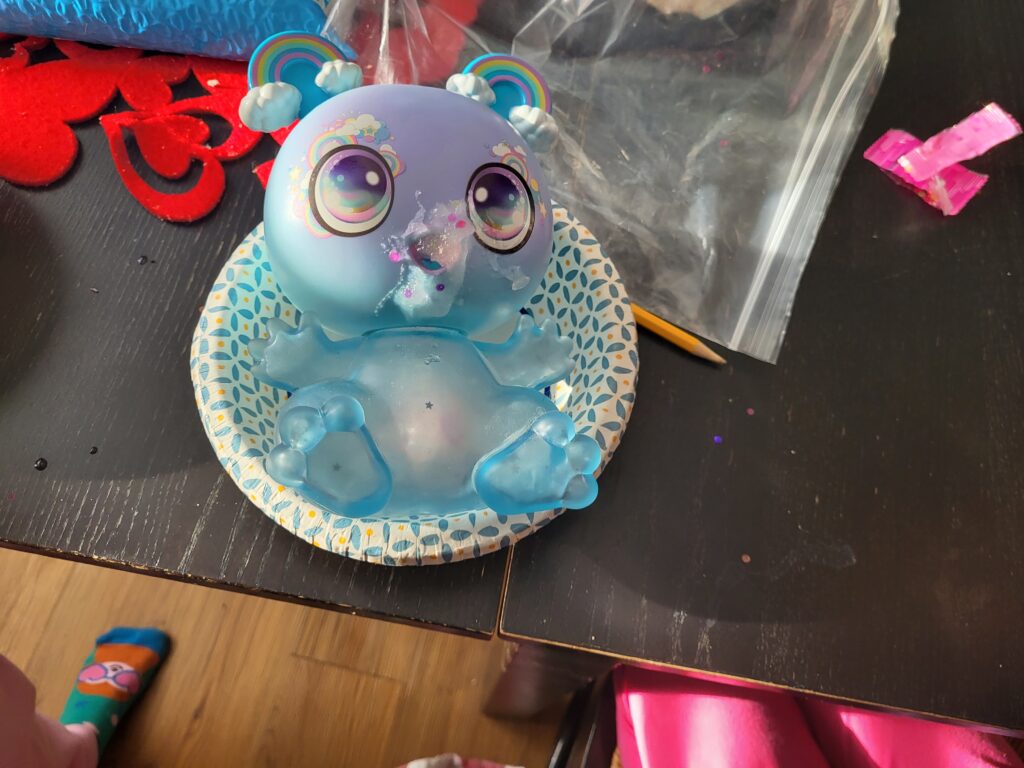 Then… this God awful slime toy. So you make a slime by mixing a powder with some water, the can add sparkles and such to it. Then you use a syringe thing to suck the slime up and feed it to the baby. After you squeeze her belly and make her throw up slime. And then you start all over again.