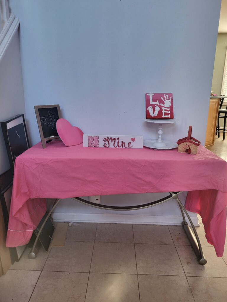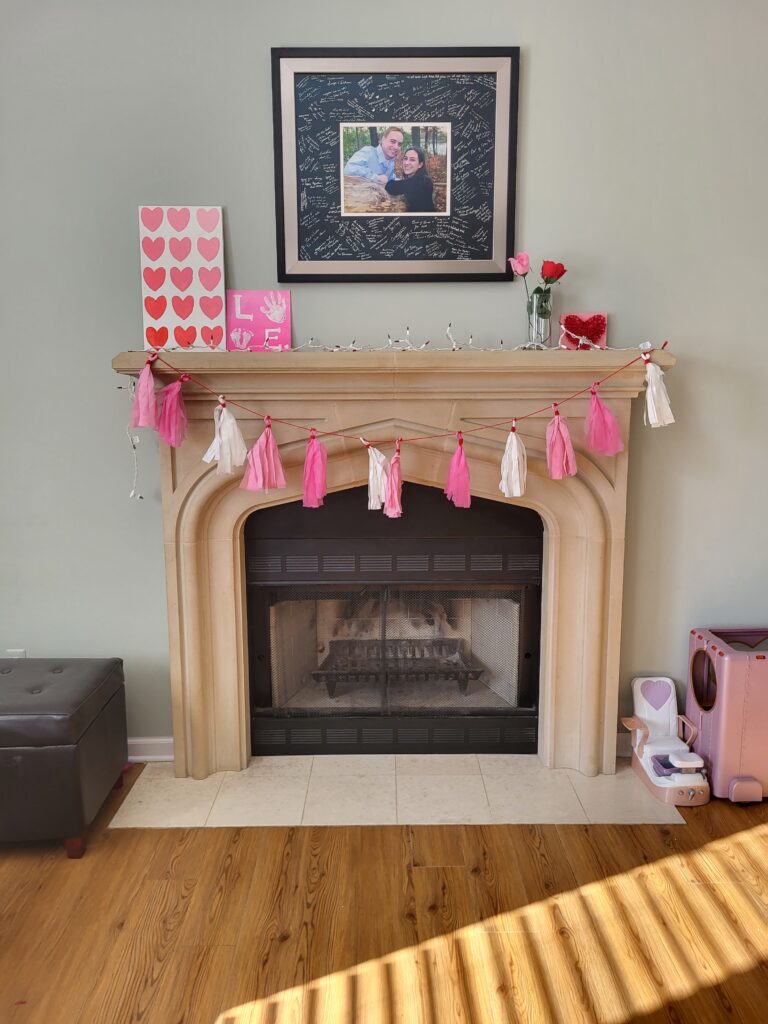 I changed up our winter décor for some simple Valentines Decorations, and switched out some of the winter books for Valentines day books. As a former elementary teacher I have lots of themed books, so we rotate them out based on the season or holiday.