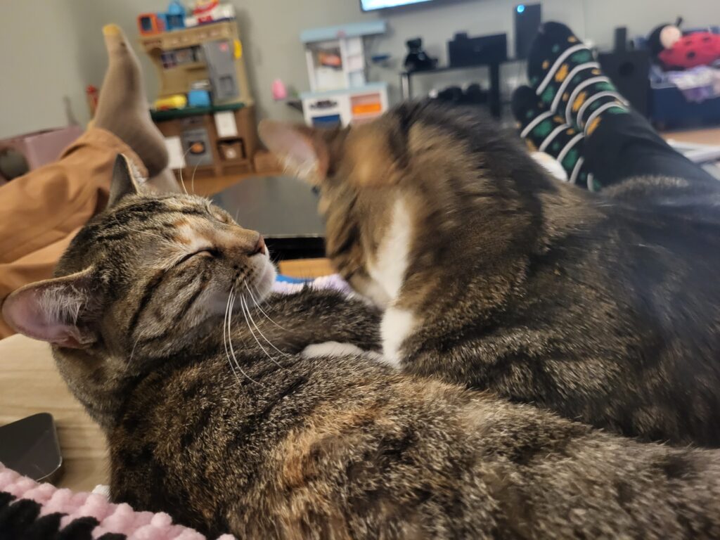 These cats. Whiskers is always bathing herself as well as bathing Pearl.