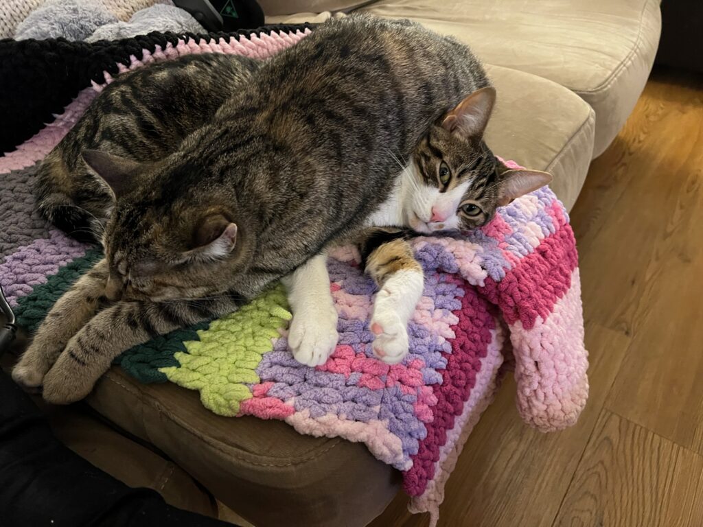 Then Pearl just plops on top of Whiskers. I think they were both mad that I had my laptop on my lap.