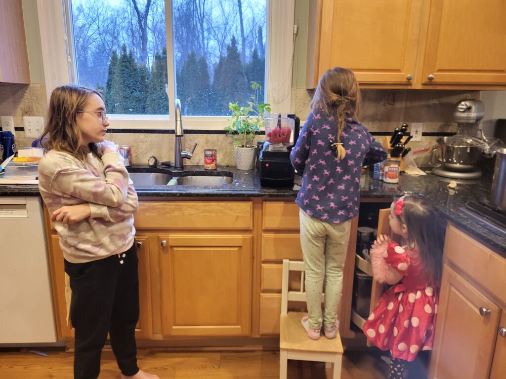 One of my goals this month is to have the girls help a little more in the kitchen (much to their dismay). My hope is that by helping me with dinner, they will be less likely to complain and more likely to eat it. This week they helped with making the shrimp spaghetti.