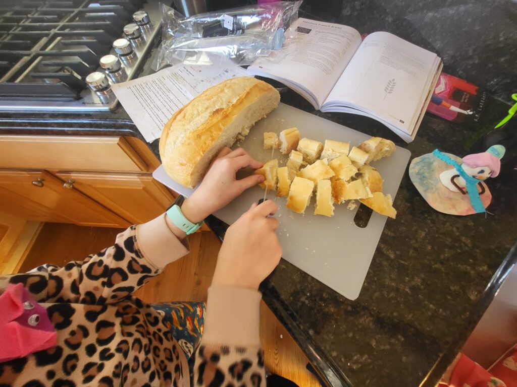 I also had the girls help me with making dinner that night. We made Jimmy Dean Sausage bake, and the girls broke the eggs into the bowl, and helped to cut the bread (I helped Aubrie with this part). They were a bit salty about helping at first, but when they realized they got to break eggs, it wasn’t as bad.
