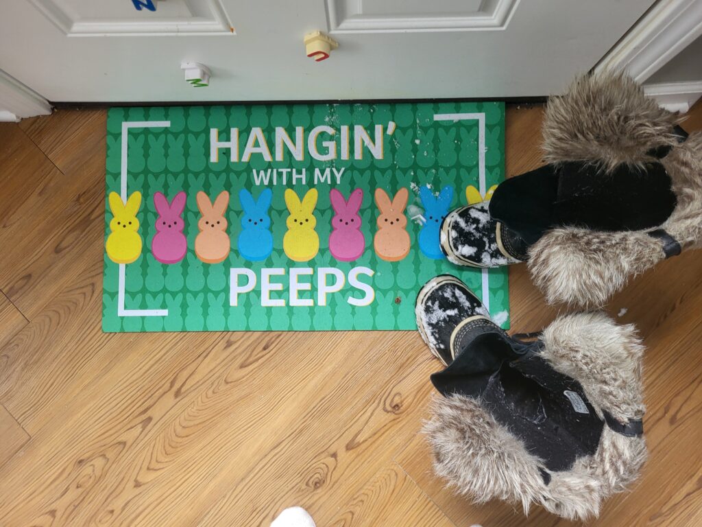 I thought it was pretty funny seeing my snow boots along with my Easter door mat. Only in the midwest….