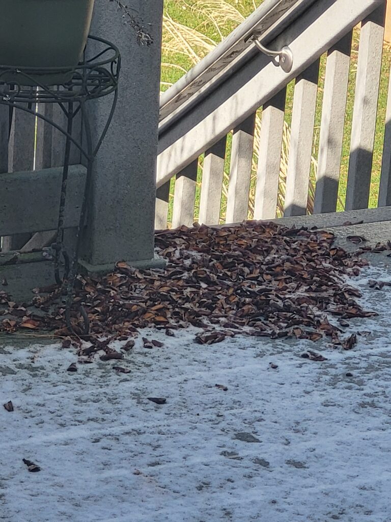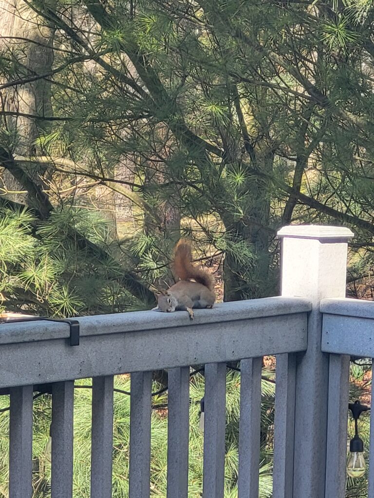 So, we have this little red squirrel that has been feasting on pinecones on our deck. He sits at pretty much the place all the time just chowing down. The amount of “pinecone crumbs” he has left on our deck is astounding.