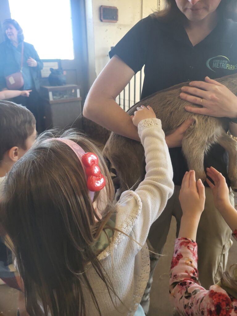 For Aubrie we went to a Farm Center at a local metro park. We got to see and pet baby goats and lambs. They also let the goats out of their pen to “play”. It was so cute to watch the goats jump around with each other.
