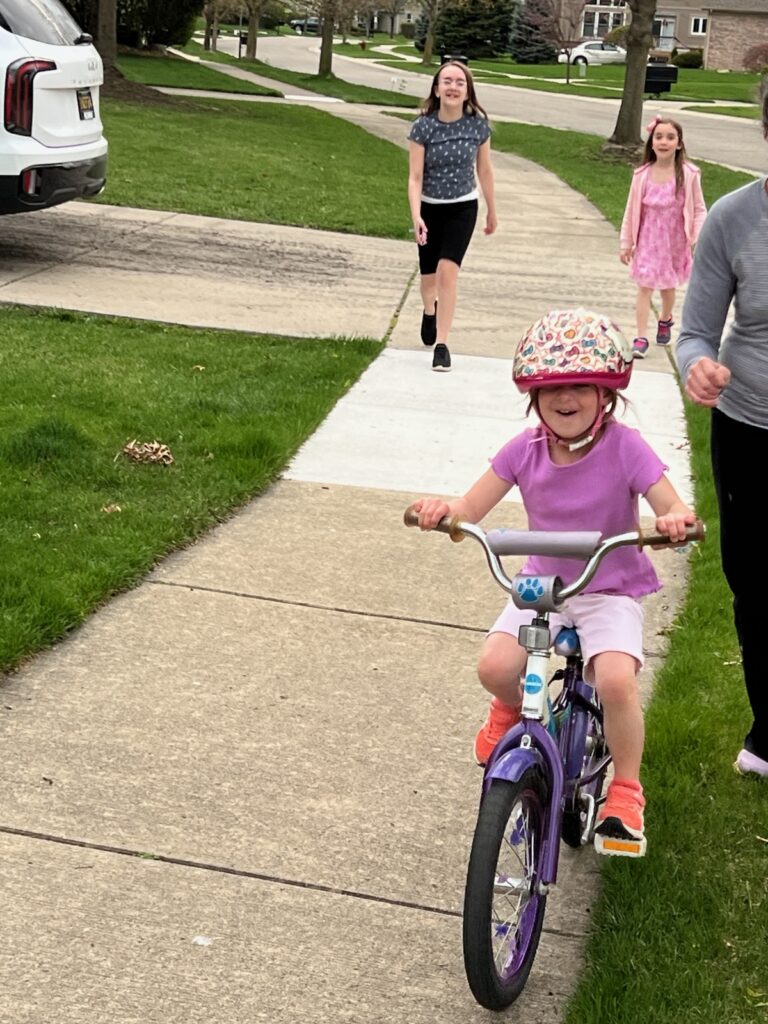 Near the end of fall last year Aubrie had just started trying to ride a two wheeler. She didn’t really have lots of time to practice, then we had to put the bikes away. Well, when the weather warmed up, we got the bikes down. In about two weeks she was riding by herself. That look on her face… she is so proud of herself!