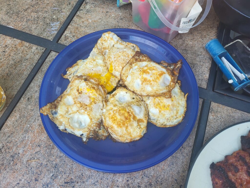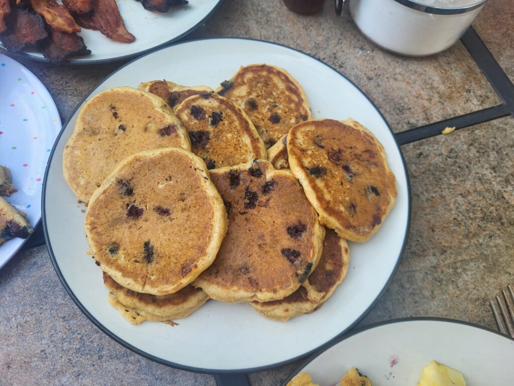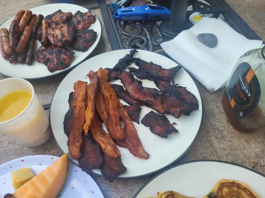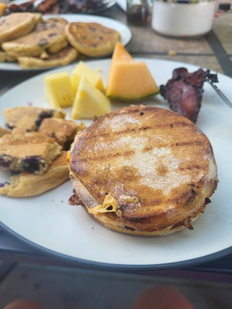 Let me tell you, this breakfast was awesome. Eggs, bacon, sausage, English muffins, sourdough pancakes, fruit. I for sure want to do this again.