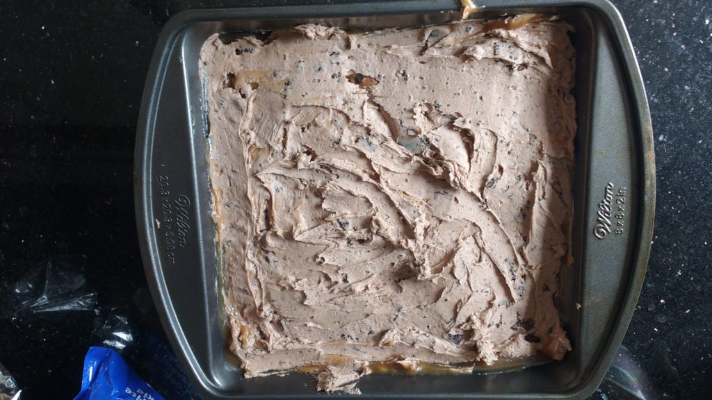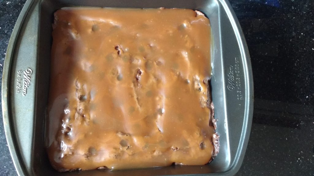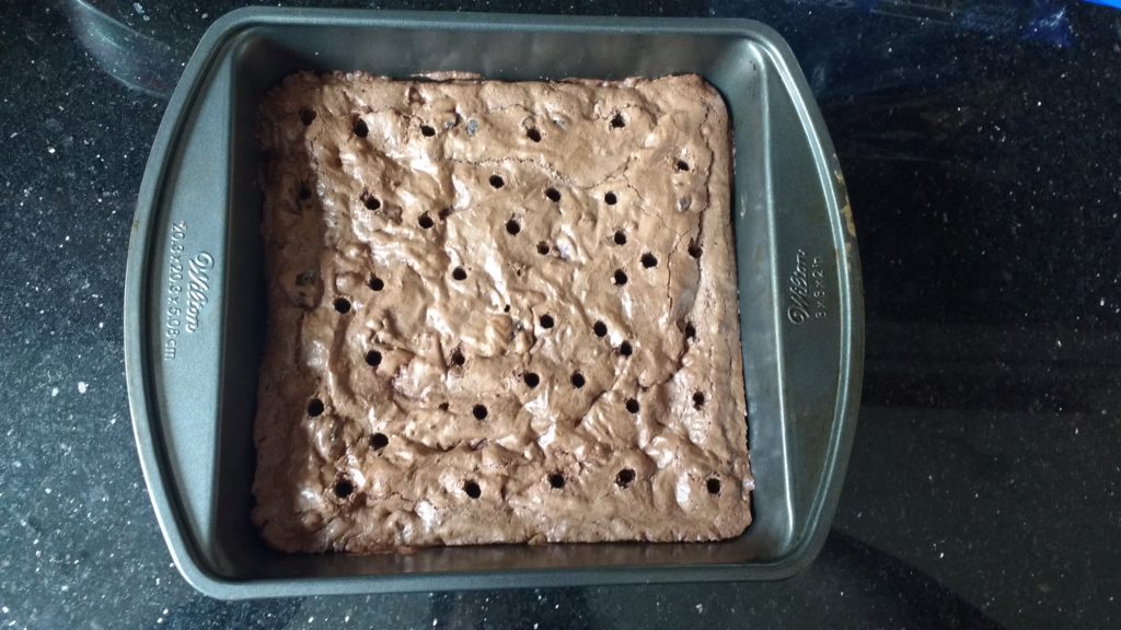 - Let brownies cool, poke holes in them, and pour 1/2 jar of caramel sauce over them.