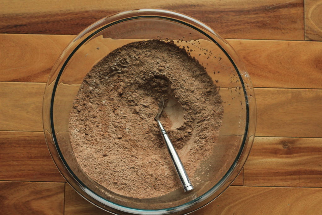 Mix the flour, cocoa powder, baking soda, and baking powder together.