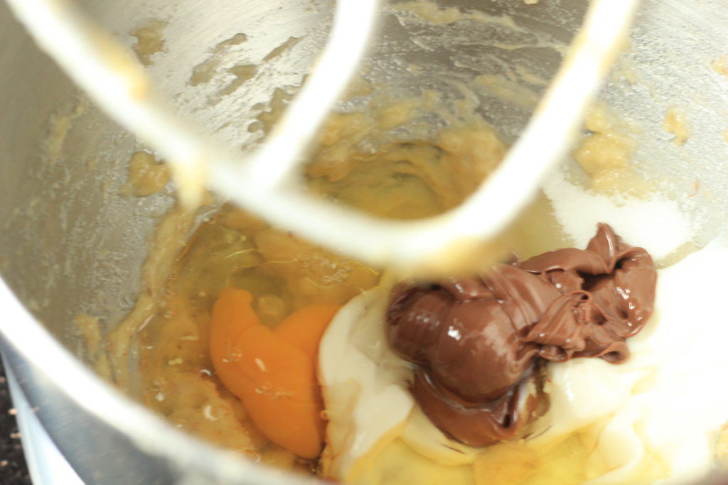 - In a stand mixer, mash the bananas using the paddle attachment. Then add the sugar, yogurt, egg, vanilla, vegetable oil, and Nutella. Mix until blended.