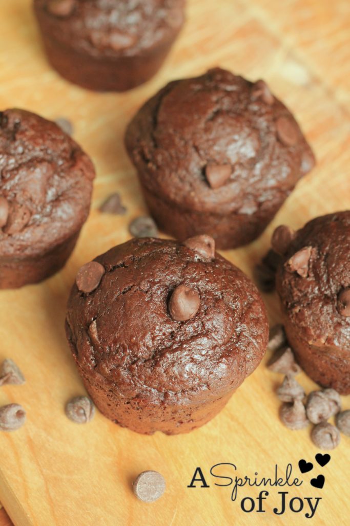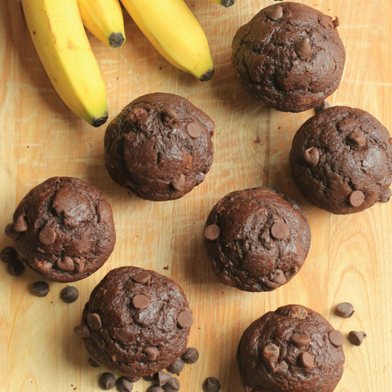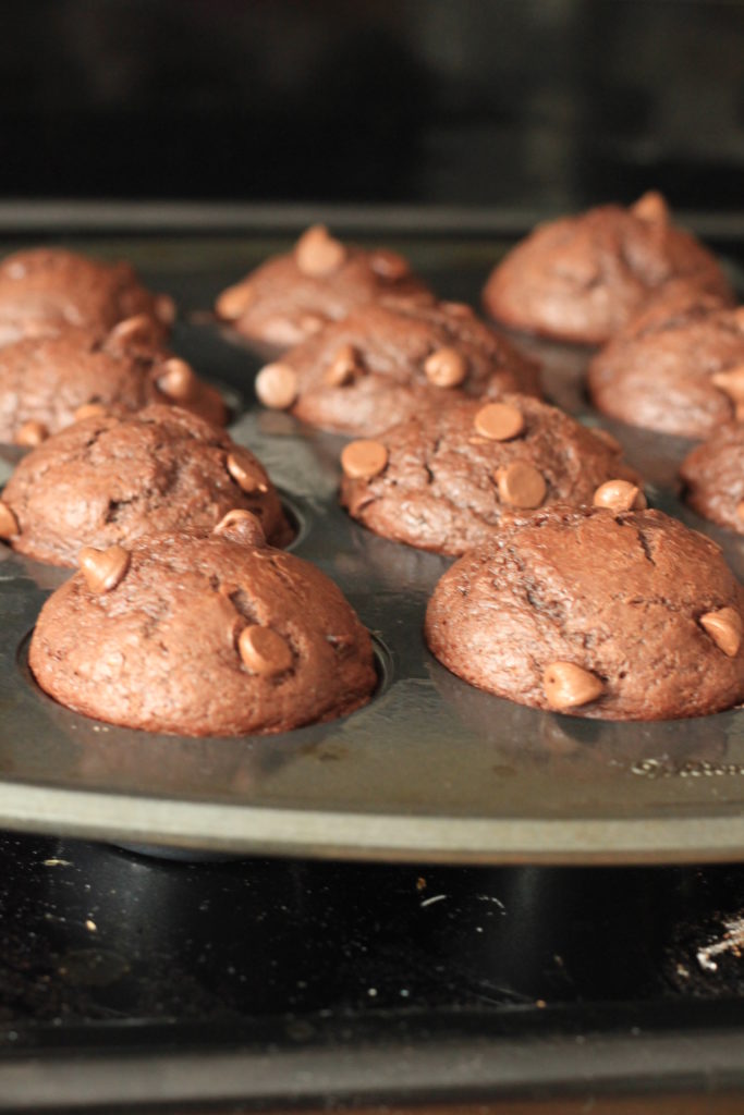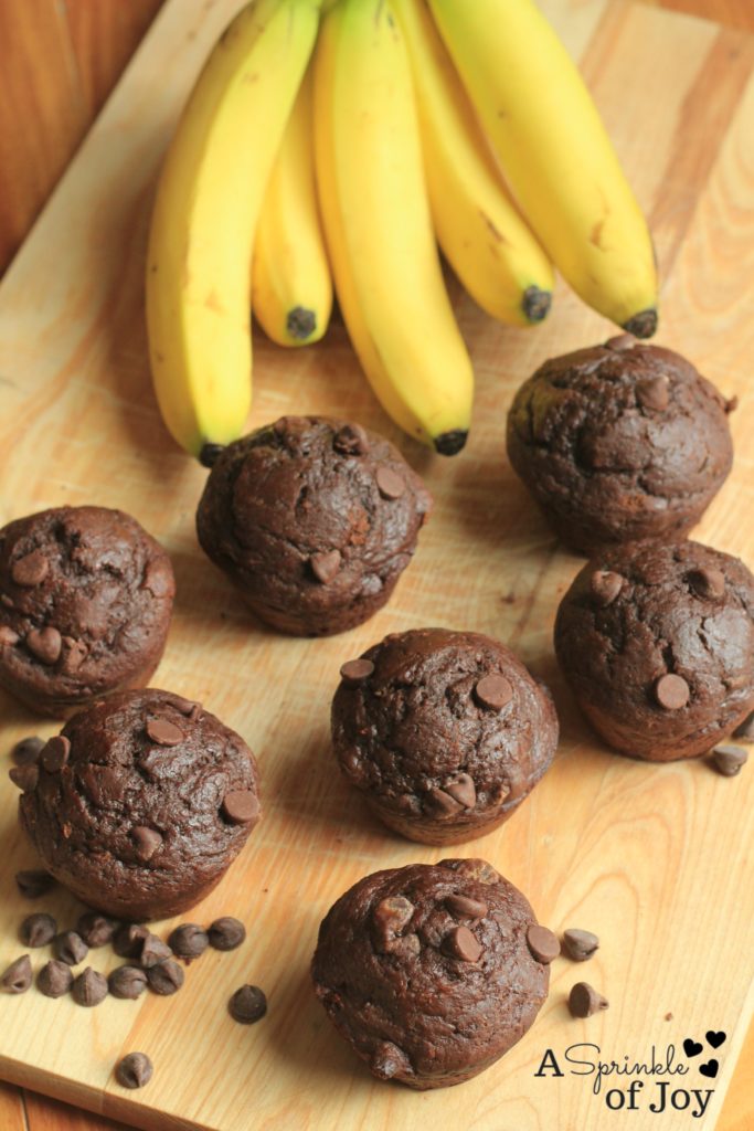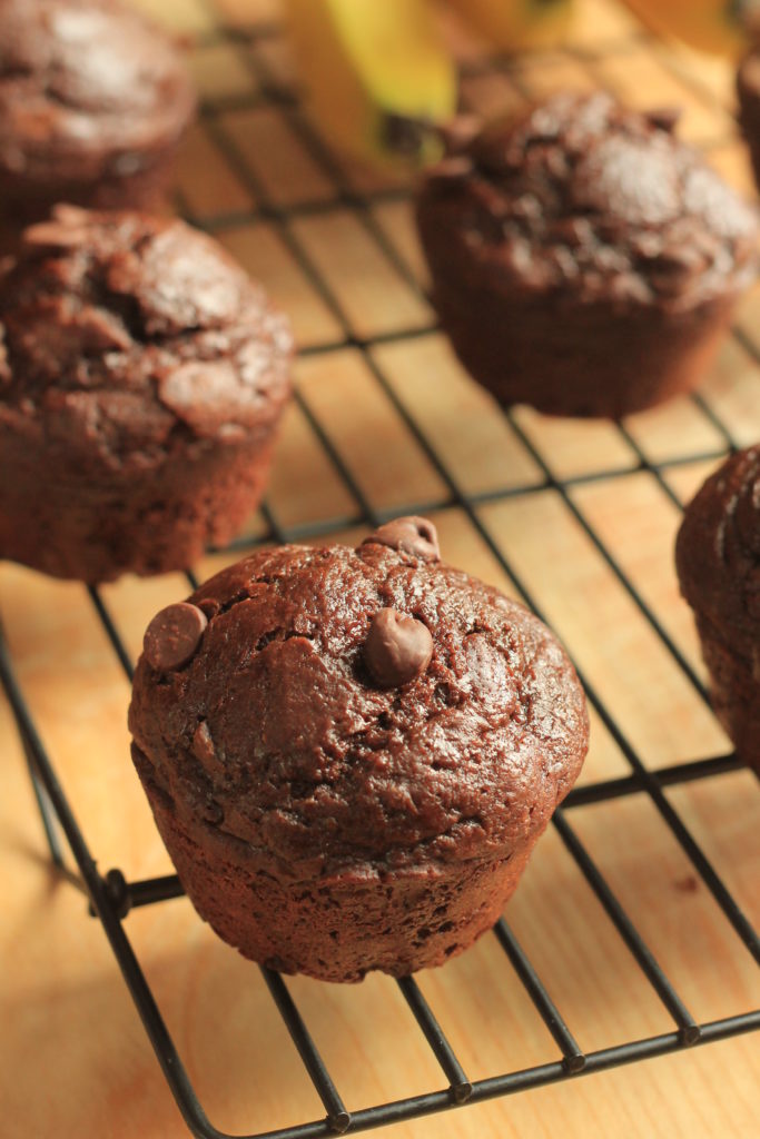 I am always looking for a good muffin recipe to use up bananas that are going brown. Â So far I’ve done a Banana Blueberry recipe, and a Nutella Stuffed Banana one. Â Both are delicious. Â This time I decided to step it up and make it extra chocolate-y.