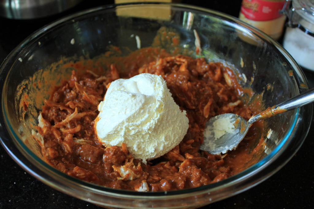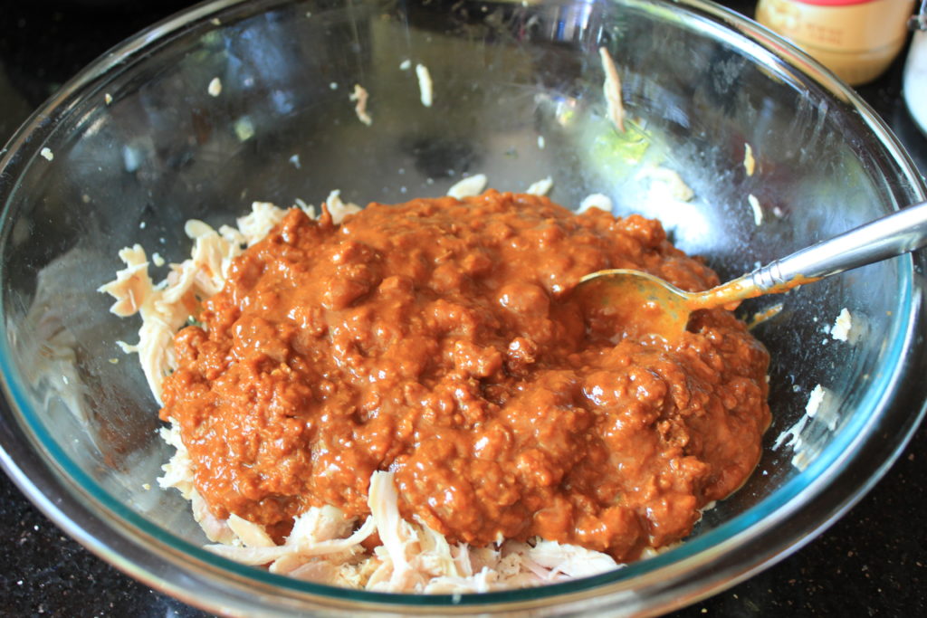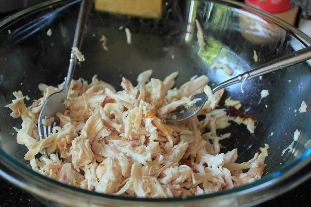 Remove the chicken from the bone and shred. It is best to do this when the chicken is warm. If you do this when the chicken is cold, then microwave it for about one minute after shredding,