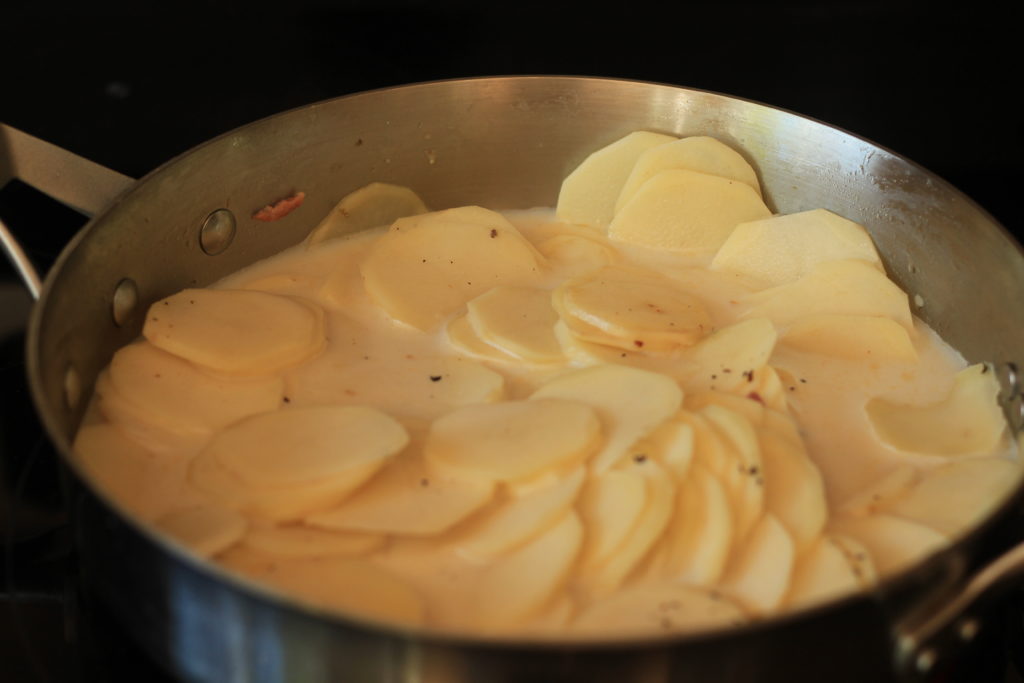After the smoked sausage has browned remove from pan. Add sliced potatoes and cook for about two minutes. Add milk, water, and a dash of salt and pepper. Bring to a boil, reduce heat, and simmer for about 15 minutes.