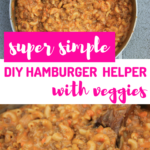 Today I want to share an easy peasy meal solution. Plus I filled this homemade hamburger helper with veggies to make it even more hearty. If your kids are anything like mine, then sometimes getting them to eat veggies can be a struggle.  This recipe disguises them a bit, which will hopefully help you sneak some into their diet.  Plus it’s quick to make, and you probably have all the ingredients on hand!