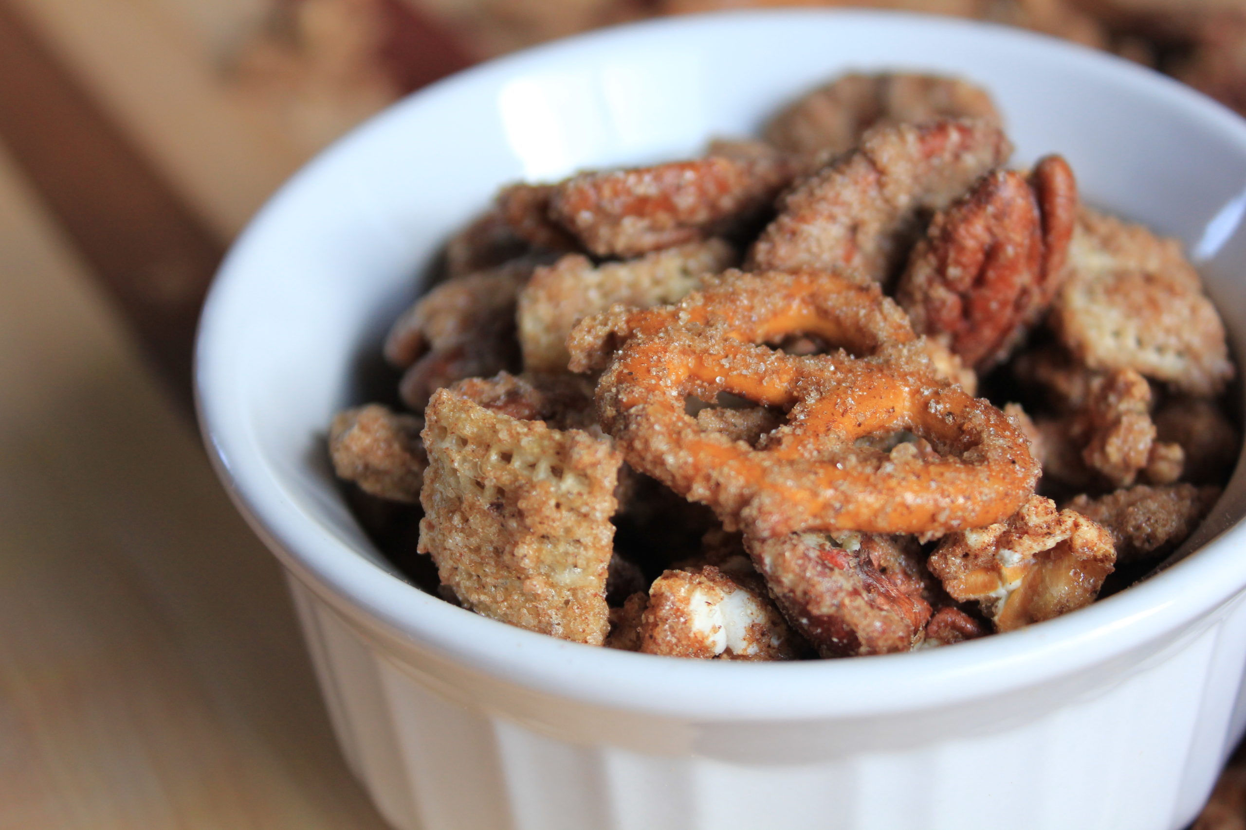 - Combine the popcorn, rice cereal, pretzels, and nuts in a large bowl.