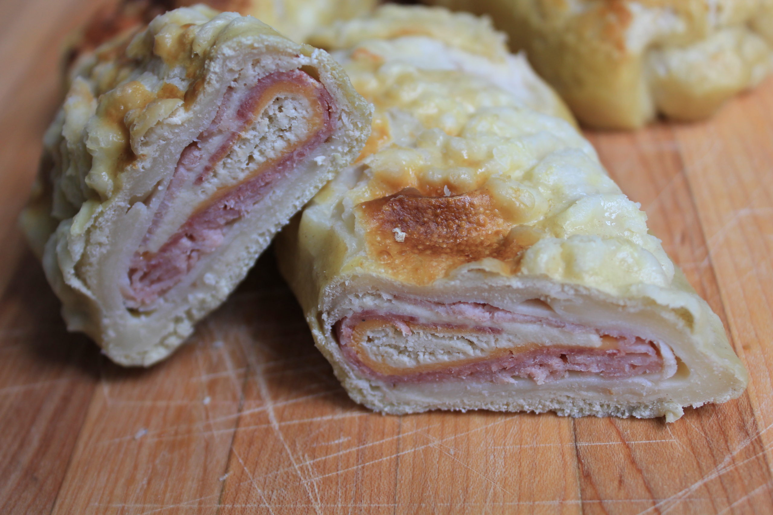 Layer the meats and cheese how you would like. Then fold in the short sides about half and inch. Starting from one long side roll the dough and meat up.