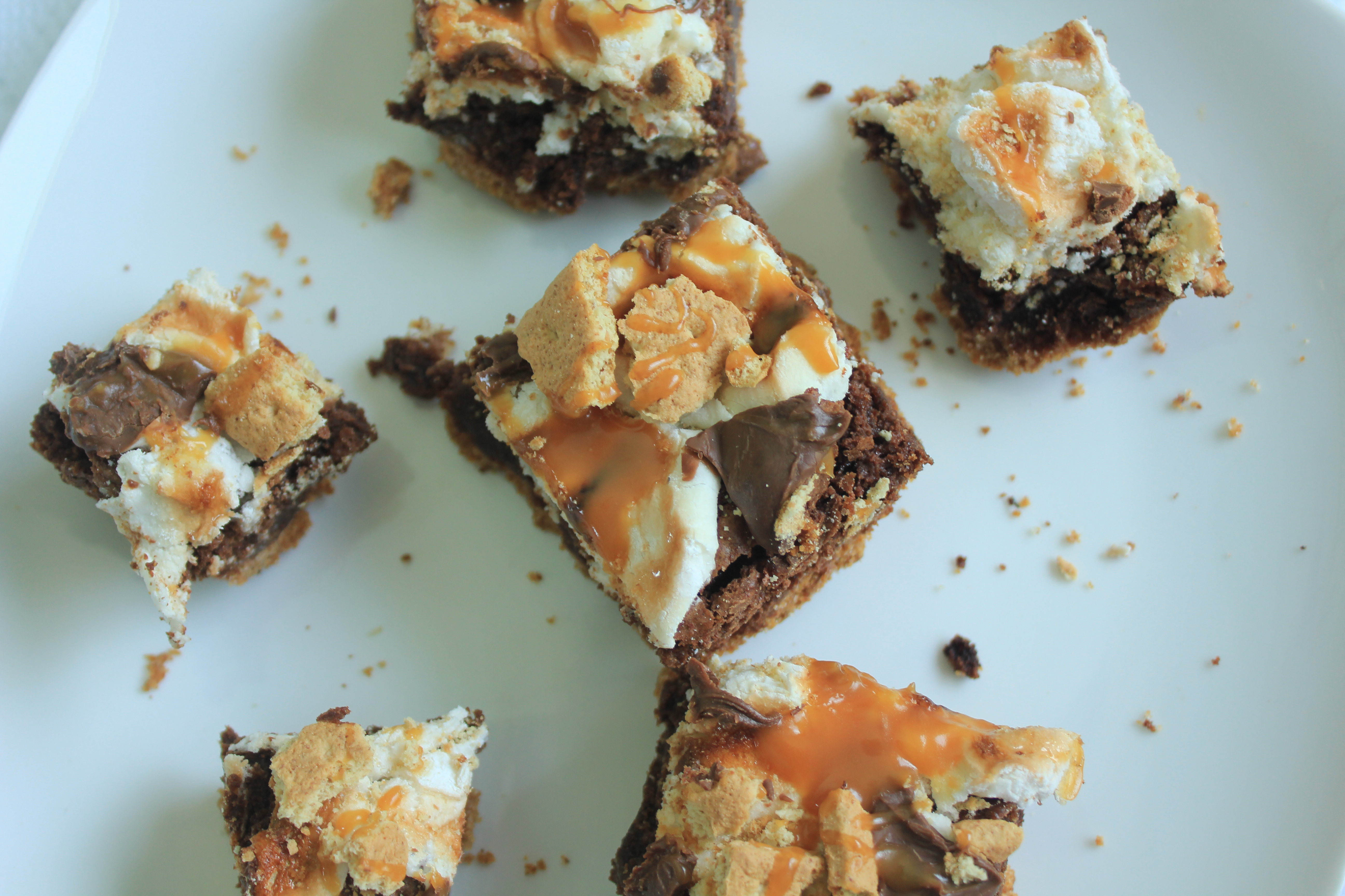 - Let them cool a little, then top with broken up graham crackers, broken up chocolate bar, and a drizzle of caramel sauce.
