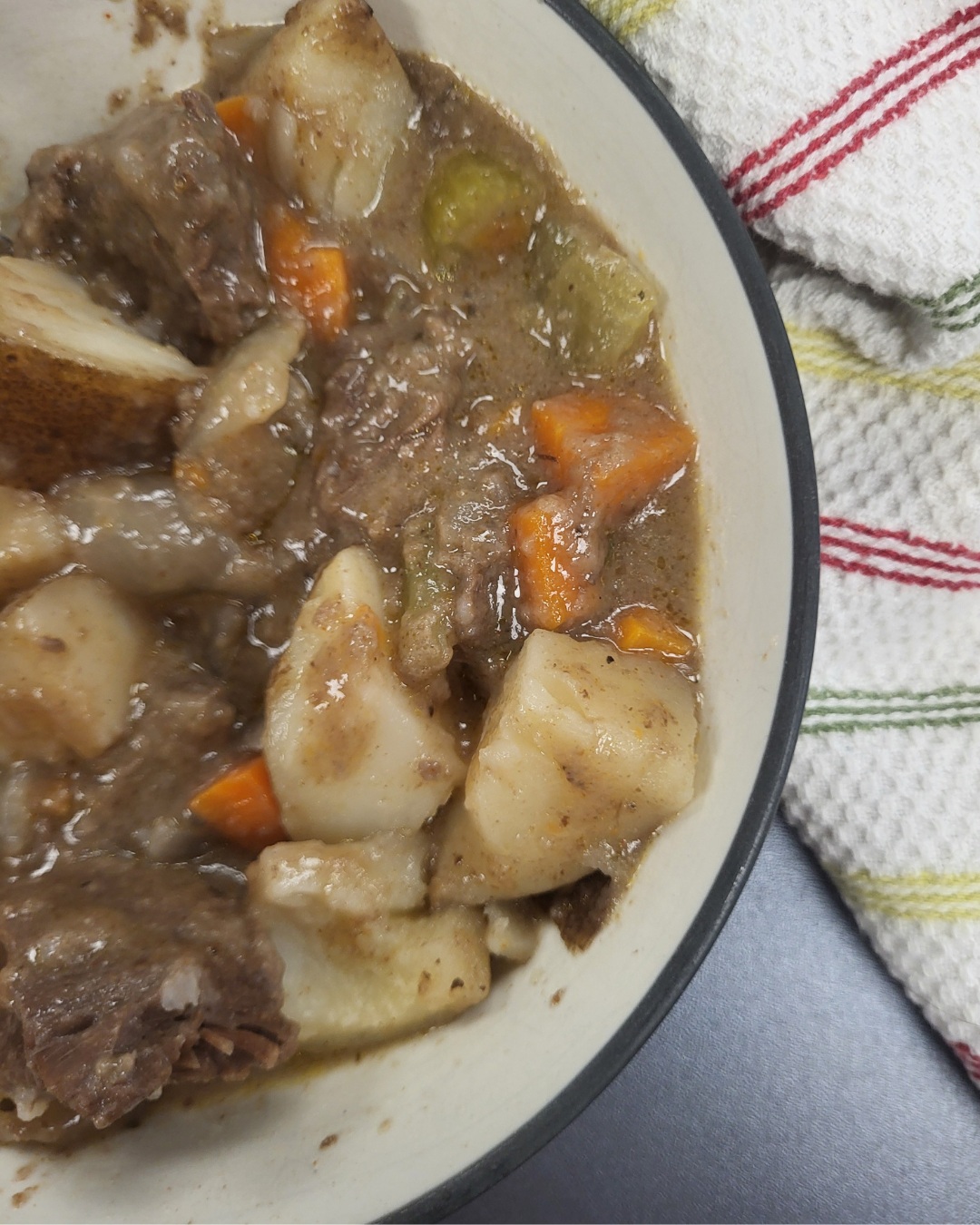 Add the water and beef stew seasoning. Bring to a boil and let simmer covered for for one and a half hours. After the hour and a half is up, add the cut veggies. Then cook for an additional 45 minutes- one hour. If needed add an extra cup or two of water.