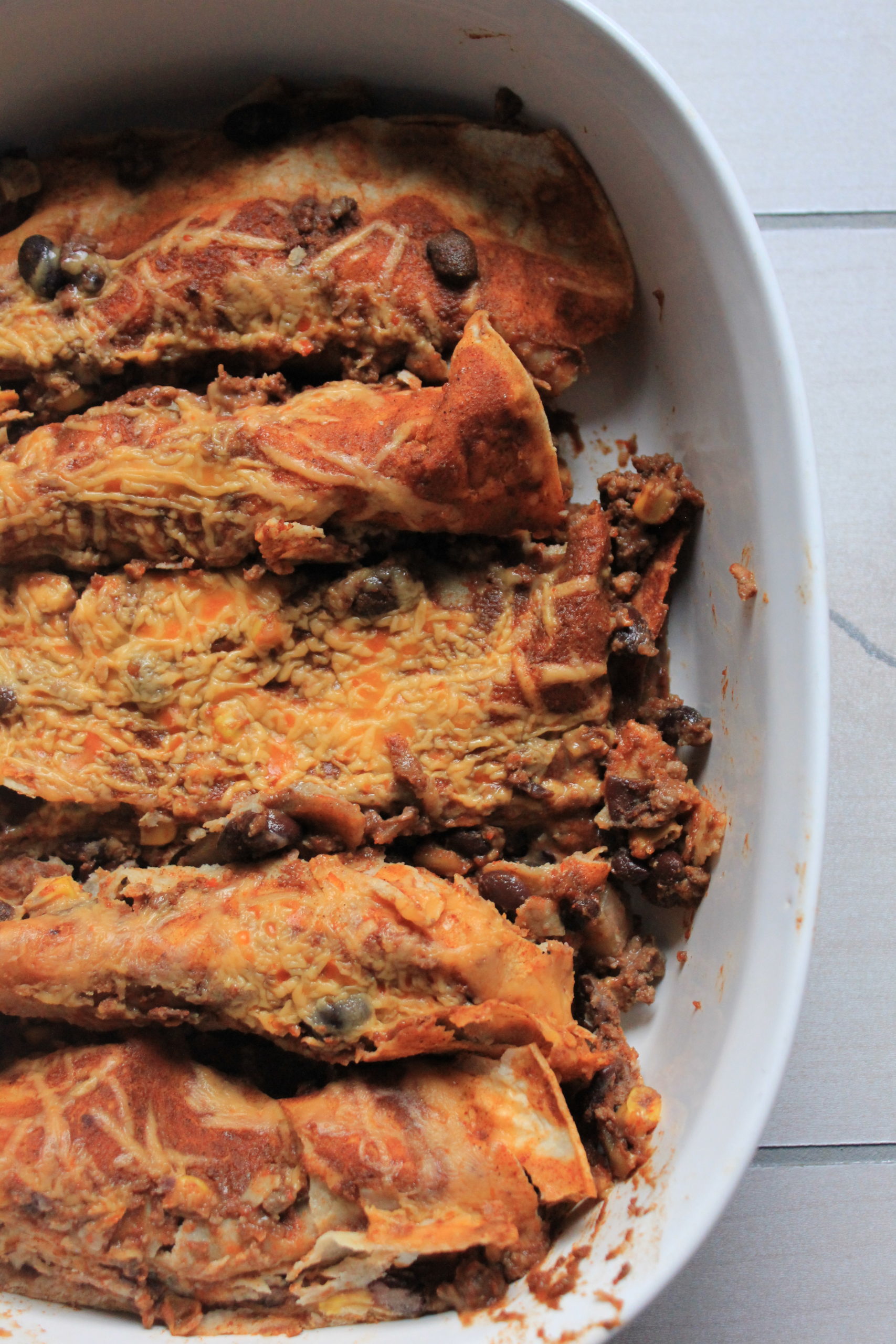 - Top with the remaining enchilada sauce, and then sprinkle with cheese. Cover with tin foil, and cook for about 30 minutes.